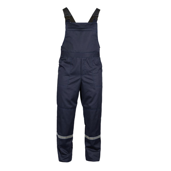 Передняя часть полукомбинезона отрезная, в средней части передних половинок накладные карманы с боковым входом.