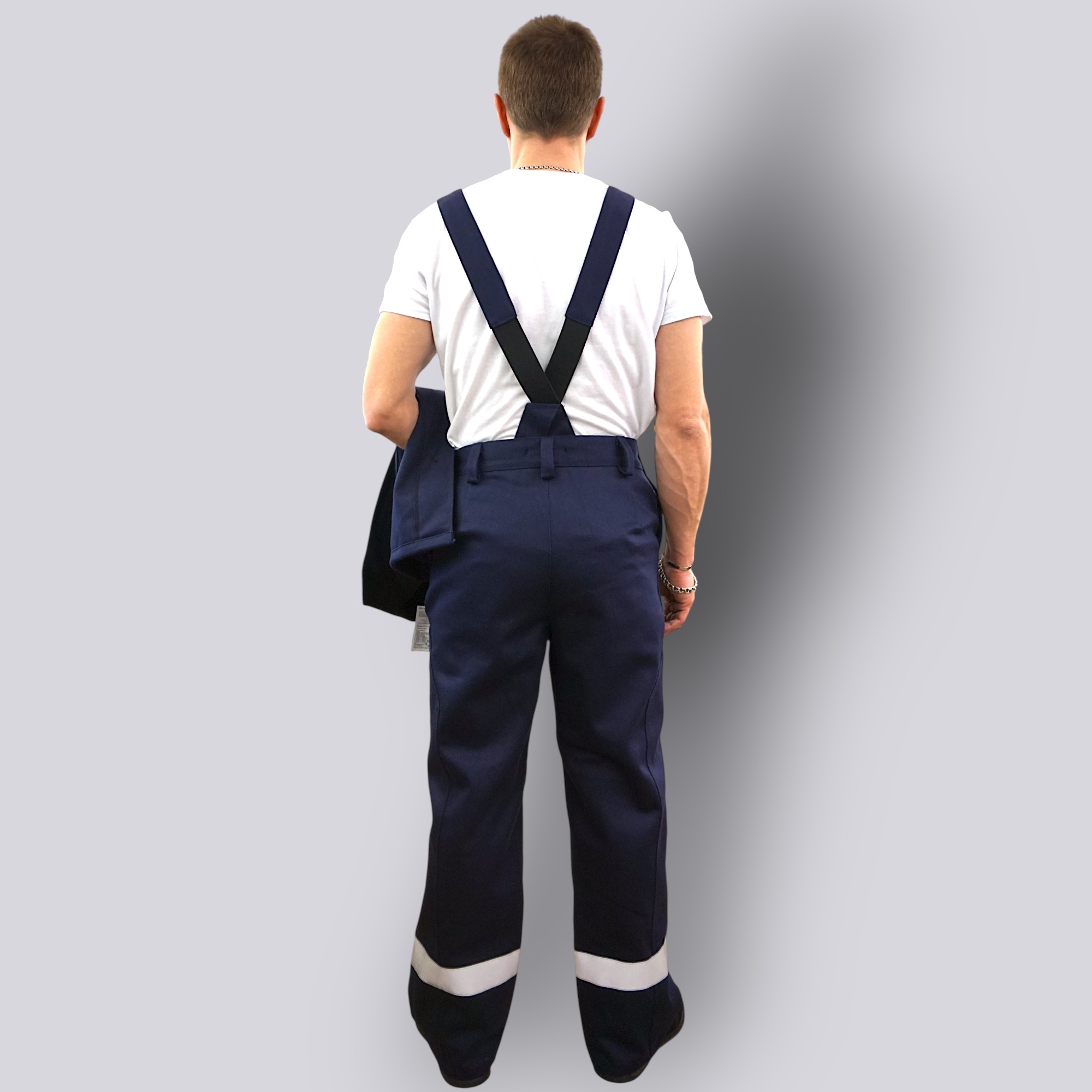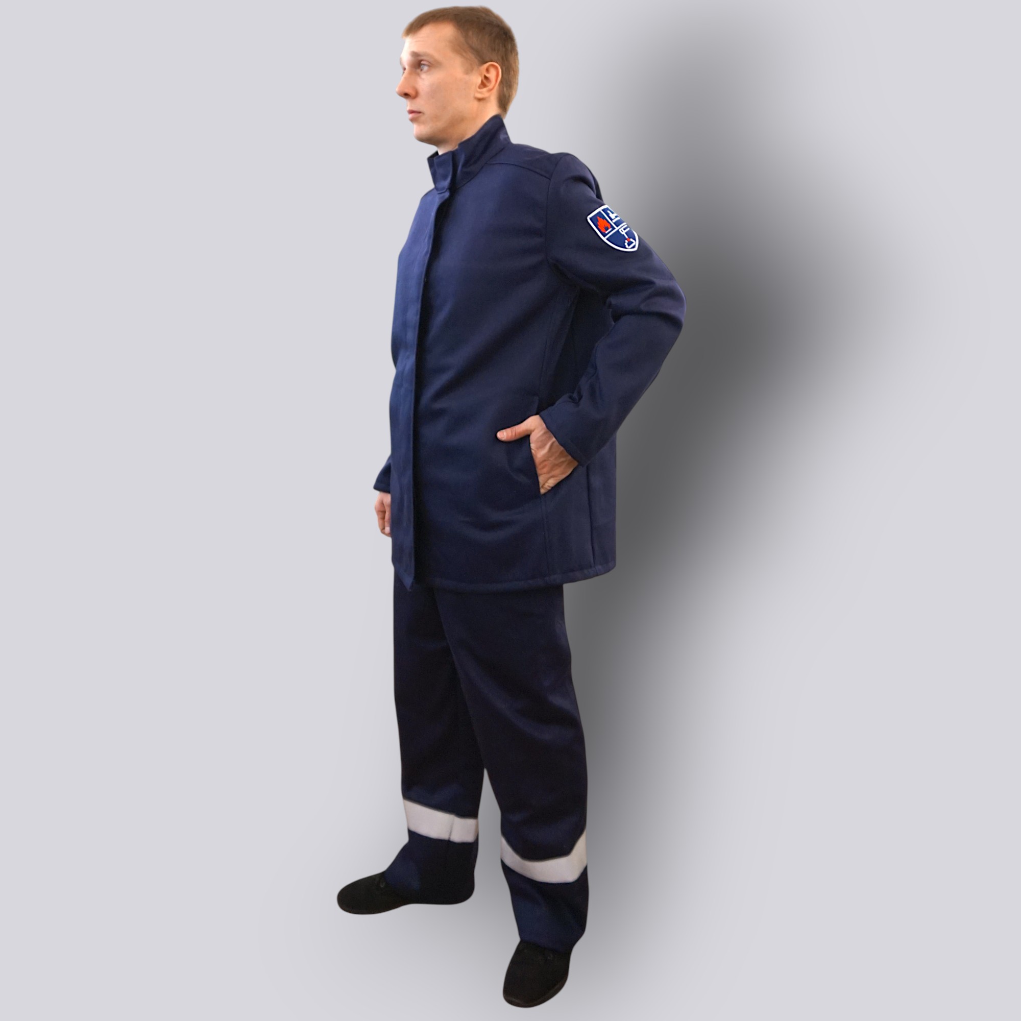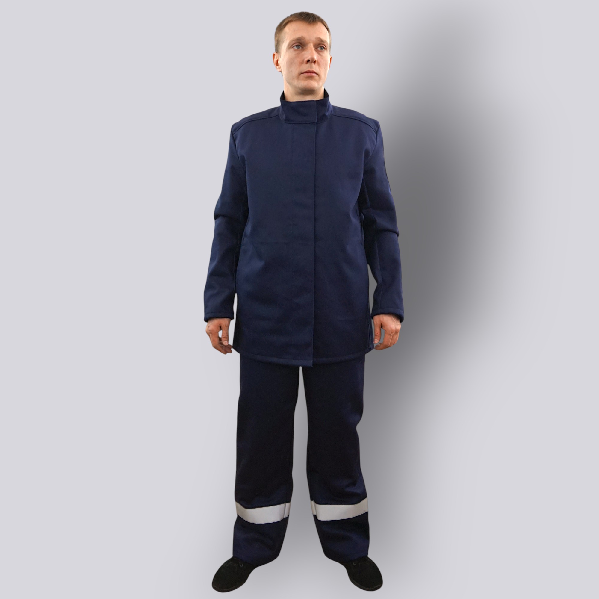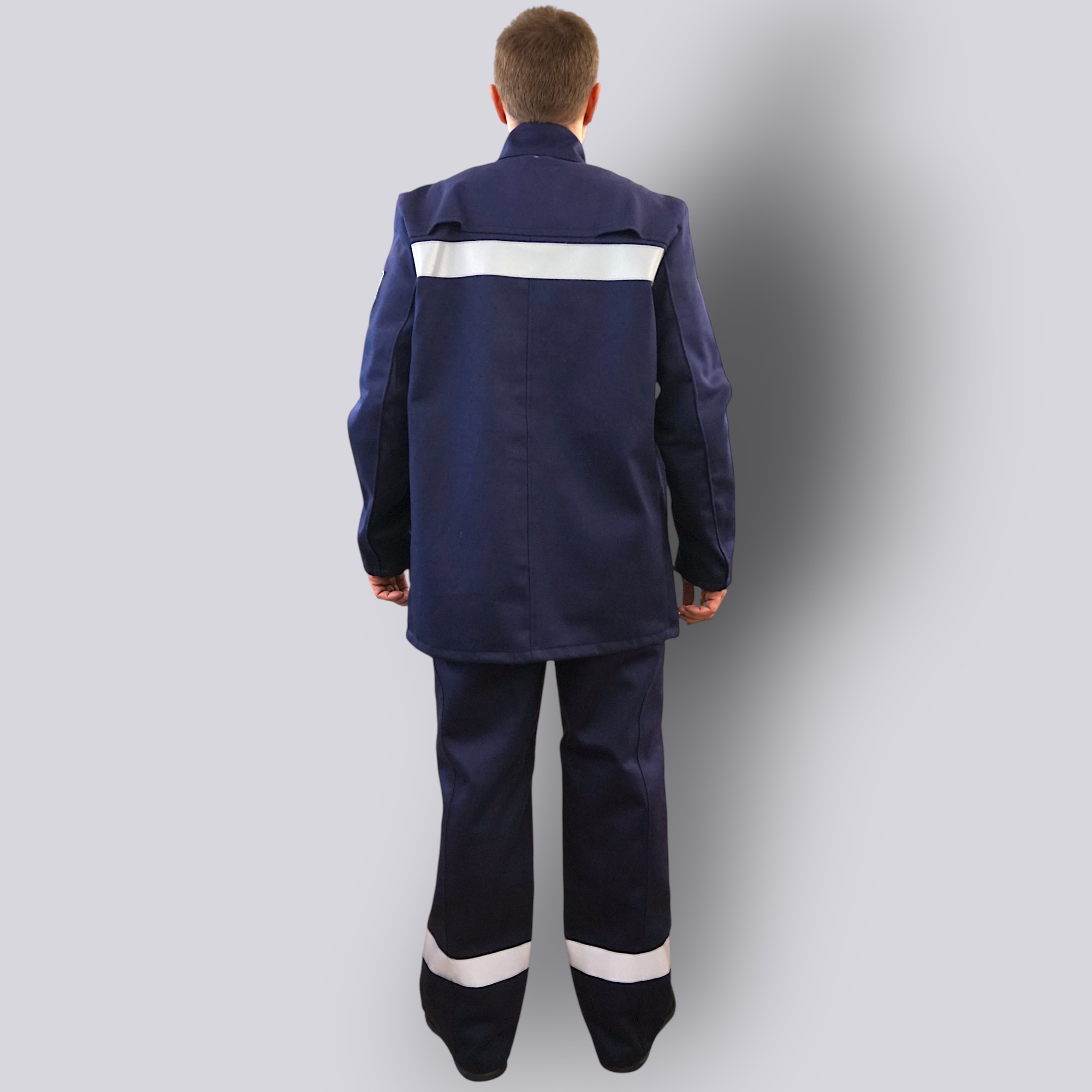 Костюм изготовлен из плотной хлопковой ткани с огнестойкой отделкой и дополнен огнестойкой световозвращающей лентой шириной 5 см для повышения видимости работника.