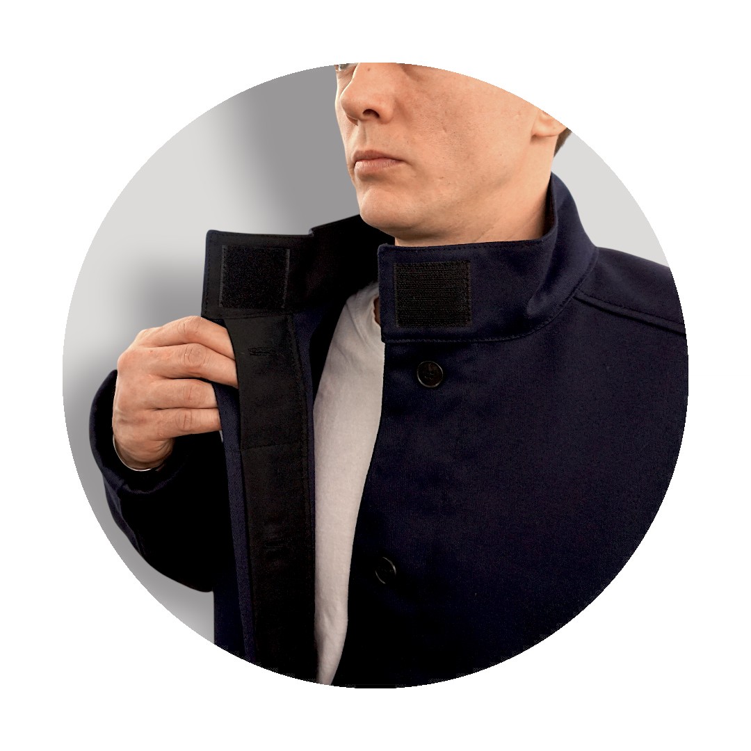 Куртка оснащена потайной правосторонней застёжкой на пуговицах и стояче-отложным воротником с накладкой из молескина, который дополнительно защищает область шеи. По запросу возможна модификация с воротником-стойкой и скрытой застёжкой на пуговицу. В конструкции предусмотрены карманы из молескина: в рельефных швах и потайной карман на левой полочке куртки. На брюках карманы расположены в боковых застёжках.