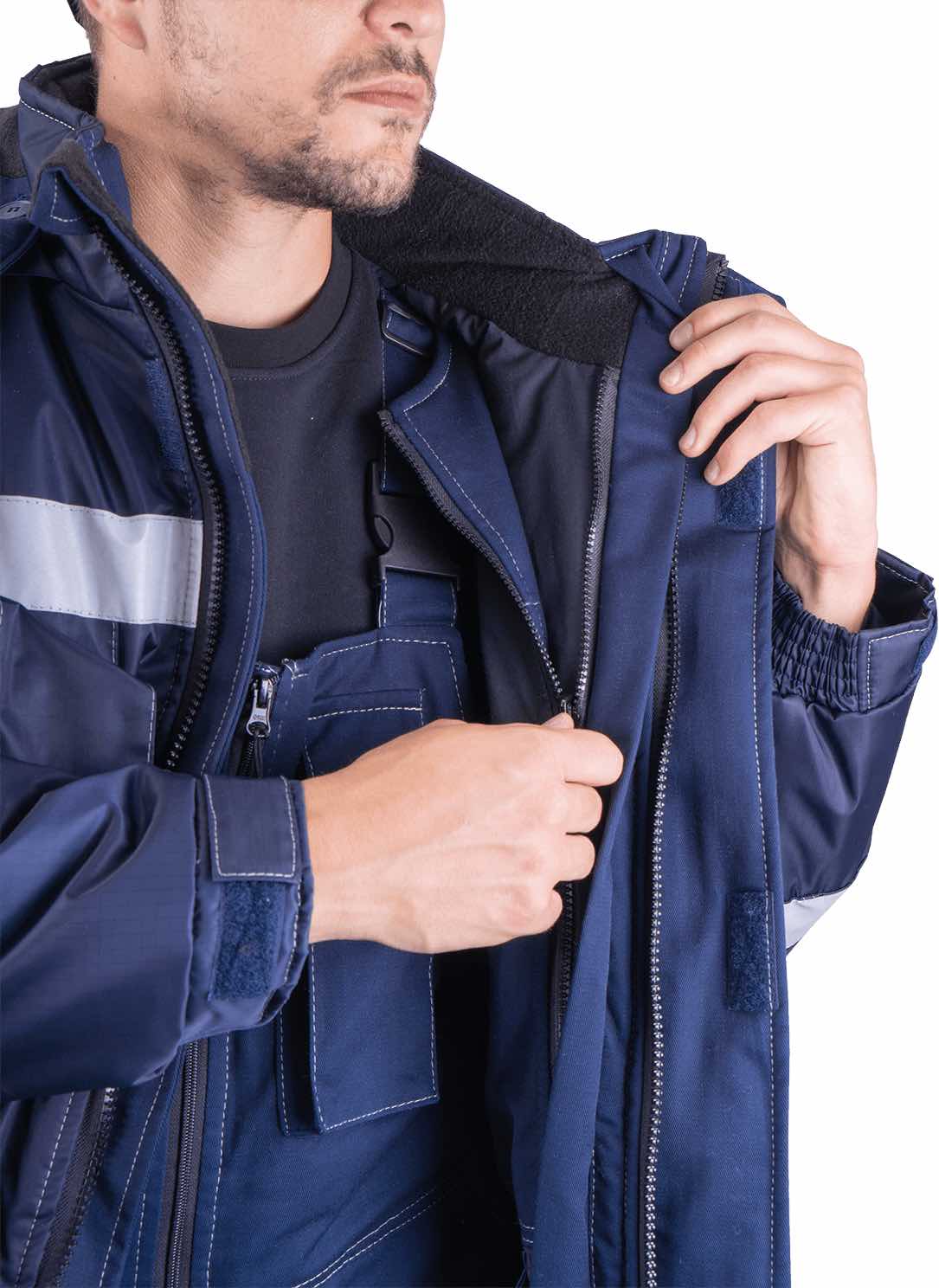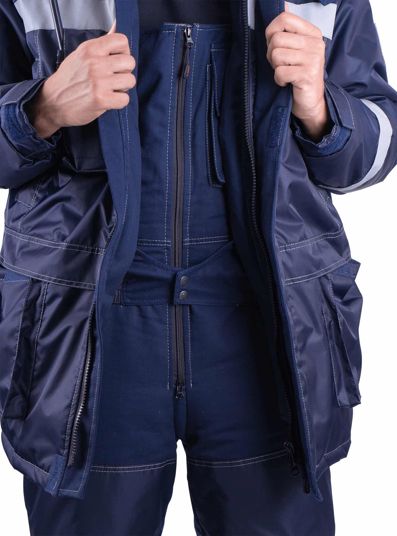 Изделие состоит из трёх элементов: зимней куртки, жилета и утеплённого полукомбинезона, что позволяет адаптировать комплект под разные условия и интенсивность работ.