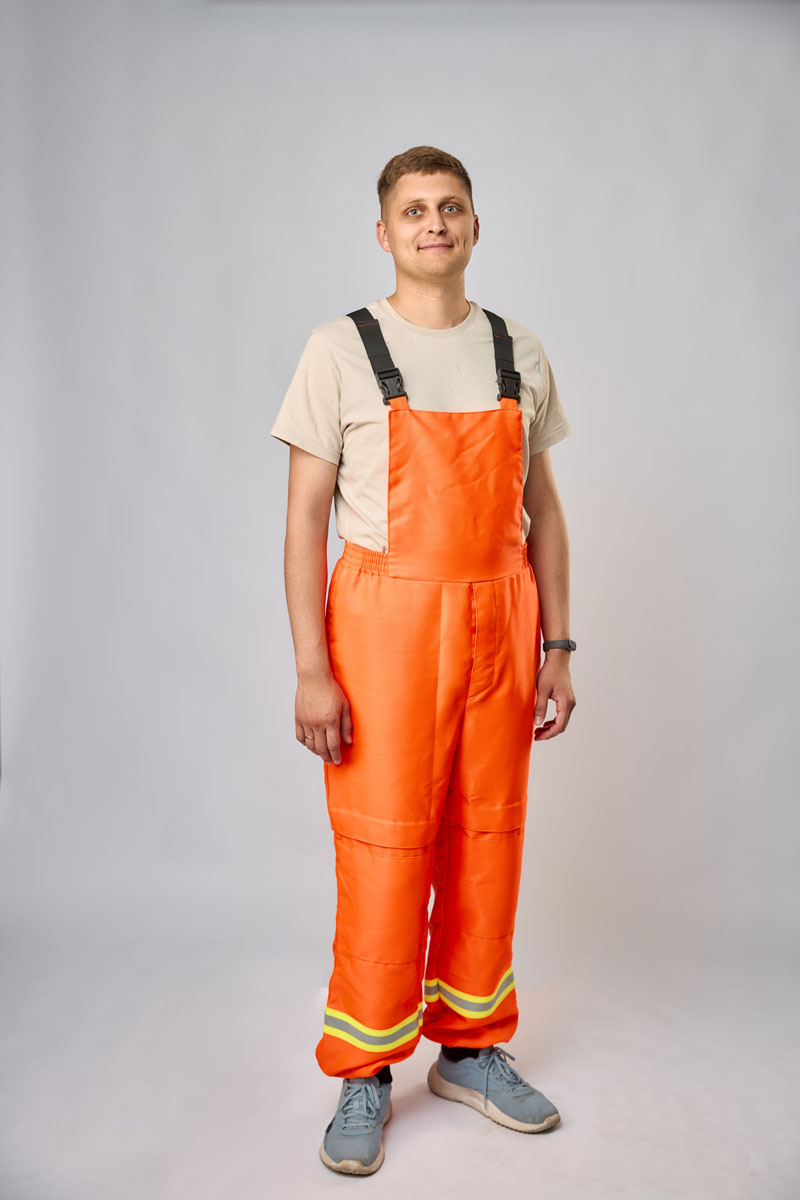 Комплект состоит из куртки с капюшоном и полукомбинезона, выполненных в ярком сигнальном оранжевом цвете, обеспечивающем хорошую заметность в задымлённой и лесной среде.