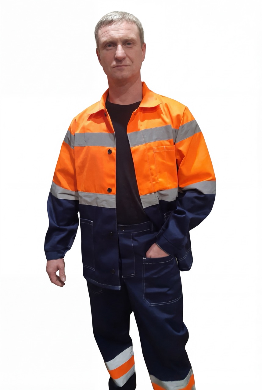 Сигнальный костюм дорожника состоит из куртки и брюк.