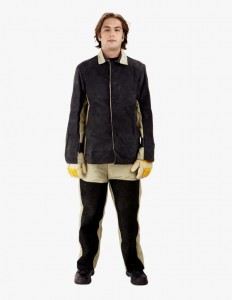 Используемый материал : Брезент  плотностью 550 г/м2 с огнестойкой пропиткой, спилок кожевенный (0,9-1,1). Куртка с потайной застежкой на пуговицах, с вентиляционными отверстиями по линии притачивания кокетки спины; под проймами отверстия для воздухообмена.