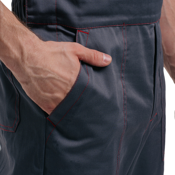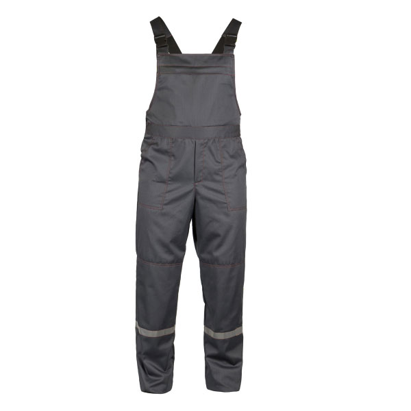 Передняя часть полукомбинезона отрезная, в средней части передних половинок накладные карманы с боковым входом.
