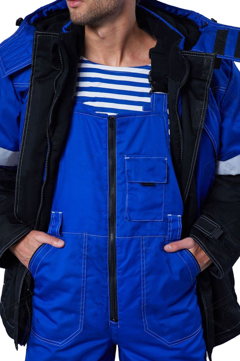 Полукомбинезон утеплённый отрезной по линии талии. Застежка спереди на тесьму «молния», в левом боковом шве на кнопки. На грудке накладной карман с клапаном. На передних половинка накладные карманы с наклонным входом. В области колен усилительные накладки с вытачками. СОП 50 мм проходит вкруговую по низу полукомбинезона.