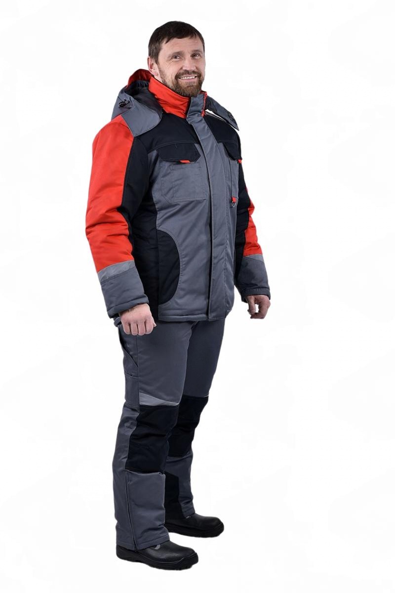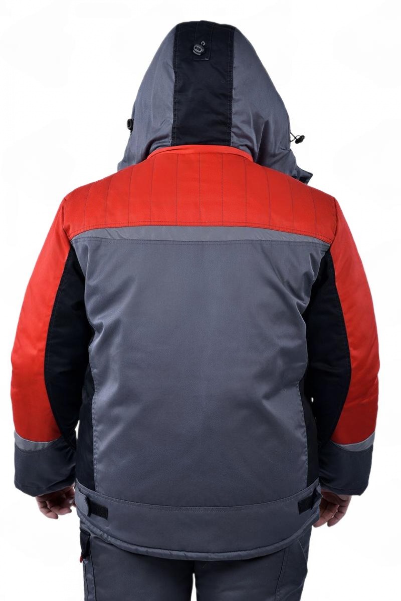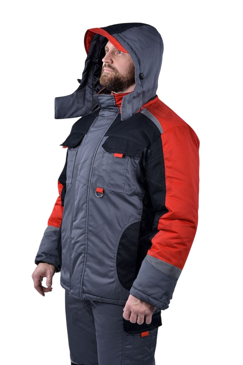 Куртка прямая с притачной утеплённой подкладкой, центральной застёжкой молнией, ветрозащитным клапаном, накладными и прорезными многофункциональными карманами. Воротник-стойка с внутренней стороны на флисе, фигурные светоотражающие полосы по кокетке.