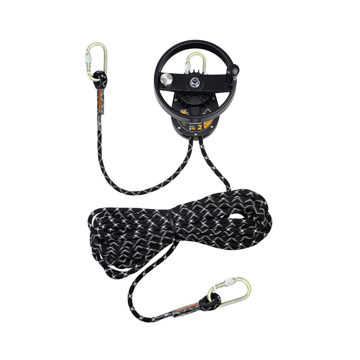 Предназначено для выполнения работ по спасению и эвакуации пострадавших при выполнении работ на высоте. Встроенная лебедка позволяет приподнять пострадавшего для того, чтобы ослабить соединительно-амортизирующую подсистему, остановившую его падение. Для облегчения данной операции устройство оборудовано складной рукояткой, адаптером для использования шуруповерта, а также ручным механизмом фиксации каната, исключающим непреднамеренный спуск.