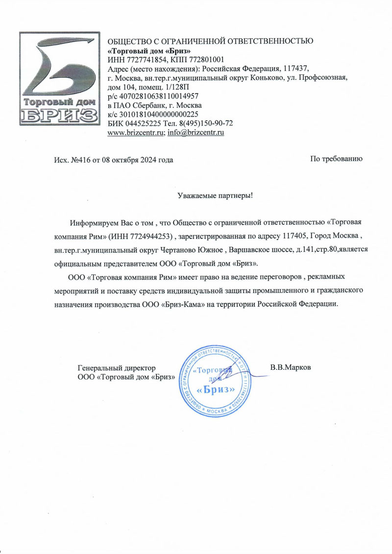 Торговый дом "Бриз" подтверждает, право на ведение переговоров, рекламных мероприятий и поставку средств индивидуальной защиты промышленного и гражданского назначения производства ООО «Бриз-Кама» на территории Российской Федерации.