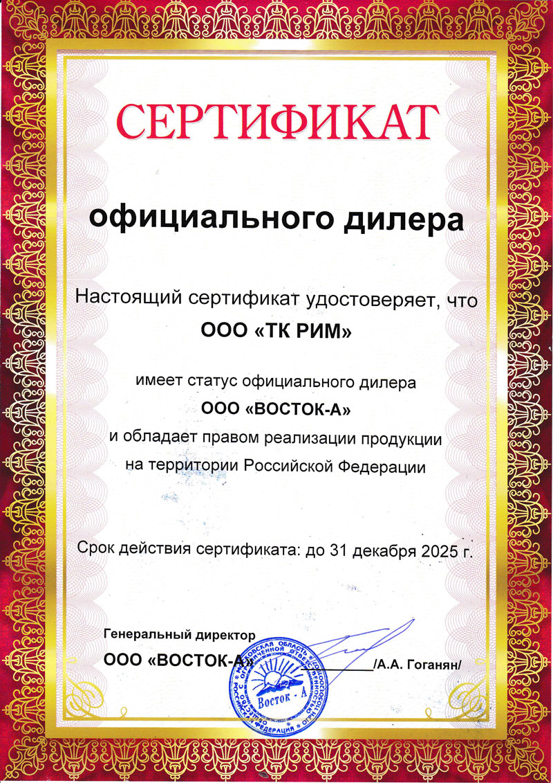 Настоящий сертификат удостоверяет, что ООО «ТК РИМ» имеет статус официального дилера ООО «ВОСТОК-А» и обладает правом реализации продукции на территории Российской Федерации