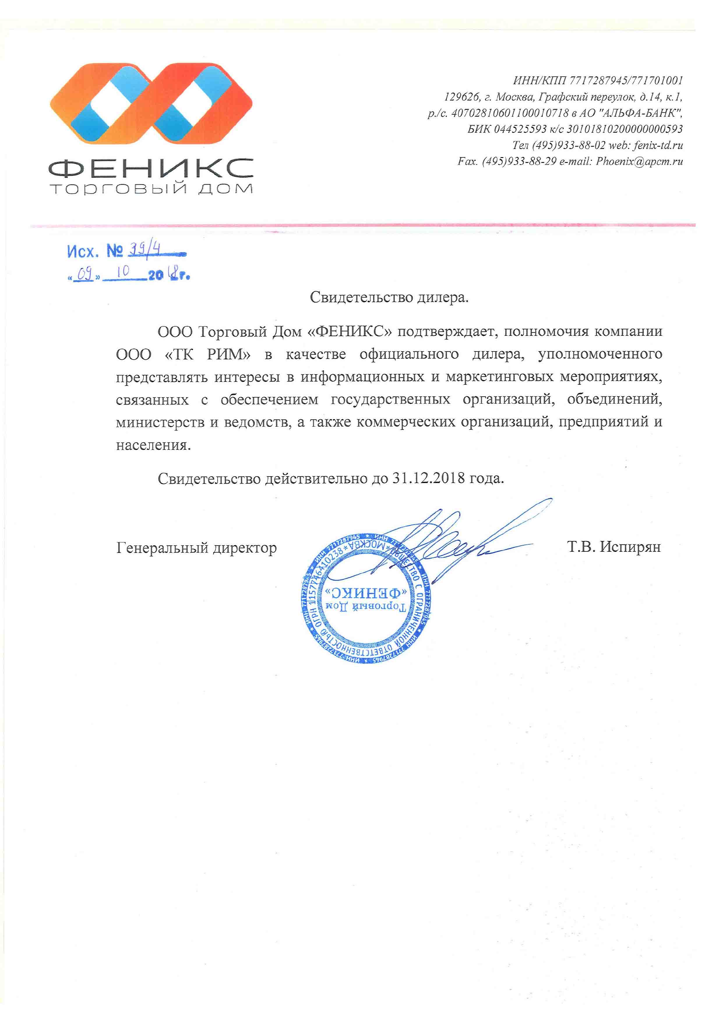 ООО Торговый дом "ФЕНИКС "подтверждает, что наша компания является официальном дилером, уполномоченным представлять интересы в информационных и маркетинговых мероприятиях.
