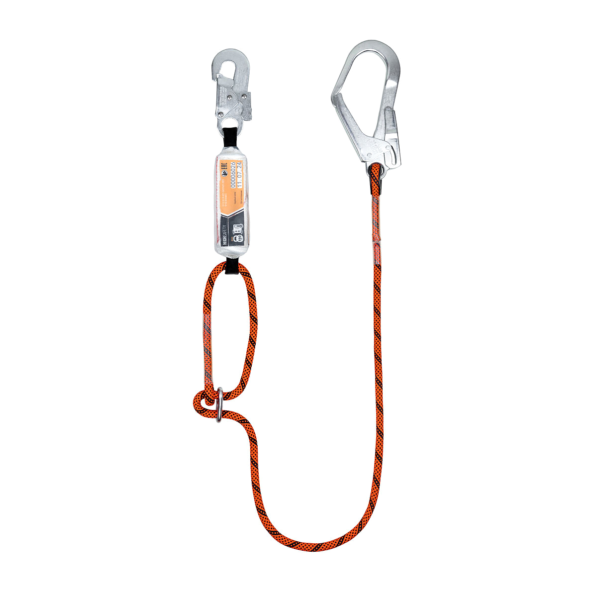 Строп изготовлен из прочного полиамидного каната. Регулировка длины выполняется оцинкованным стальным кольцом. На одном конце расположен амортизатор, на другом — карабин класса А, закреплённый в усиленной петле с коушем из ПНД. Все окончания защищены ПВХ-термоусадкой и прошиты сигнальной нитью для визуального контроля целостности.