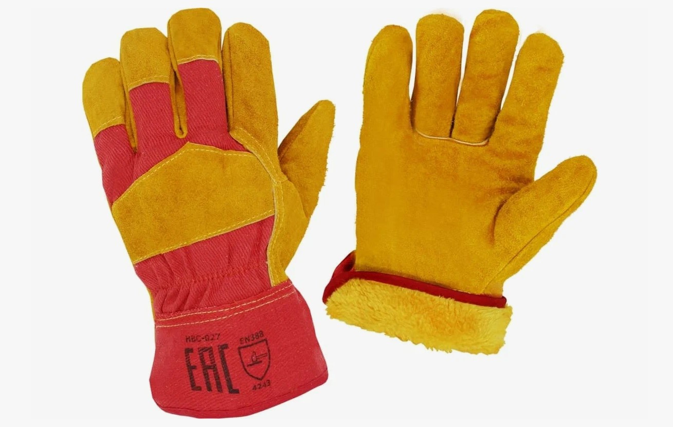 Перчатки комбинирванные, плотная смесовая ткань красного цвета со спилком сорта А желтого цвета, усиленная жесткая крага, утеплитель - искусственный мех 600 гр/м2. Мягкий спилк 1,3мм, двойные швы. Высокая стойкость к истиранию и разрыву, ограниченная защита от пореза и прокола.